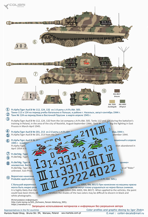 Главная Декали, Маски, Трафареты Colibri Decals Декали 1/35 (БТТ) Colibri Decals 35118 PzKpfwg. VI Ausf.B Tiger II (s.Pz.Abt 505)
